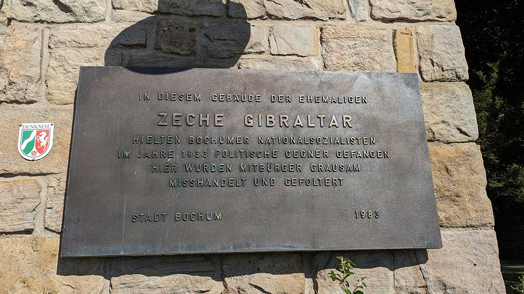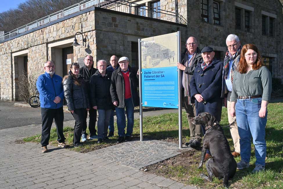 Die Bezirksvertretung Bochum-Süd hat im September 2022 die Errichtung einer Stele auf dem Gelände der ehemaligen Zeche Gibraltar See beschlossen, die an die Geschichte dieses Ortes als Folterort der SA aufmerksam machen soll. Diese Stele ist vom Stadtarchiv – Bochumer Zentrum für Stadtgeschichte entworfen und vom technischen Betrieb der Stadt Bochum Anfang des Jahres aufgestellt worden. Bei einem Ortstermin am Kemnader See hat Archivleiter Dr. Kai Rawe die Stele nun Bezirksbürgermeister Helmut Breitkopf und Mitgliedern der Bezirksvertretung, einem Vertreter der Vereinigung der Verfolgten des Naziregimes – Bund der Antifaschistinnen und Antifaschisten (VVN-BDA) und der Freizeitgesellschaft Metropole Ruhr mbH, die Eigentümer der ehemaligen Zechengebäude ist, vorgestellt. Das Gelände der ehemaligen Zeche Gibraltar wurde seit dem Frühjahr 1933 von der SA genutzt, um ca. 250 politische Gegner, insbesondere Sozialdemokraten, Kommunisten und Gewerkschafter rechtswidrig gefangenzunehmen, hier her zu verschleppen, zu foltern und zur Zwangsarbeit zu zwingen. Noch bevor in Deutschland Konzentrationslager offiziell eingerichtet wurden, war die ehemalige Zeche Gibraltar zu einem solchen Konzentrationslager geworden. Seit 1983 erinnert eine auf Initiative des ehemaligen Gibraltar-Häftlings Emil Schewenerdel errichtete Gedenktafel an das hier verübte Unrecht und das erlittene Leid. Diese Gedenktafel wird nun durch die neu errichtete Stele um weitergehende, sachliche Informationen zur Geschichte der Zeche als Folterort der SA ergänzt.